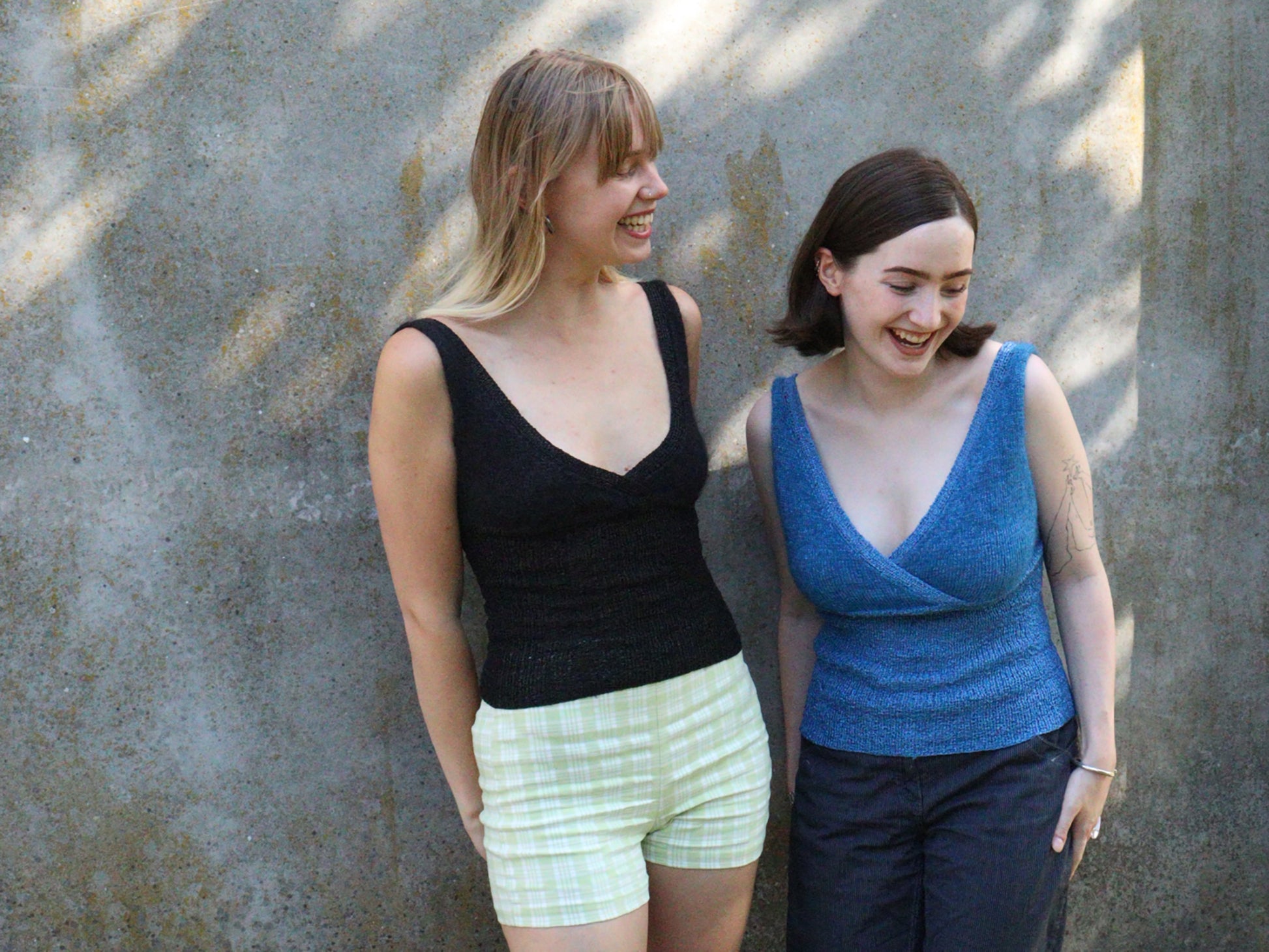 Nyx Top strikkes nedefra og op. Først strikkes kroppen rundt i rib med glimmergarn. Øverste del strikkes frem og tilbage i glatstrik med glimmergarn og kid mohair. Til sidst sys skuldermaskerne sammen, og der strikkes ribkant i glimmergarn.