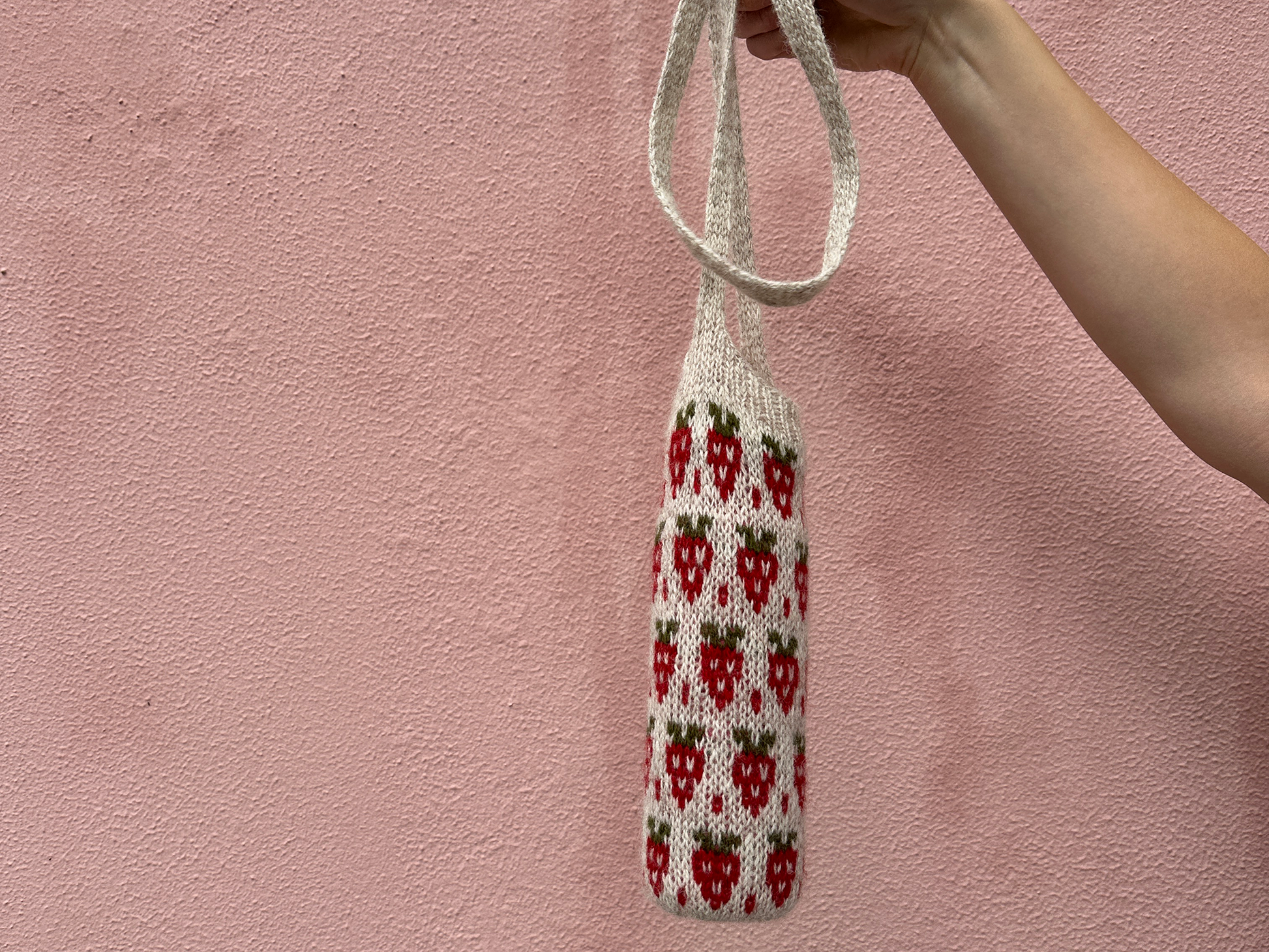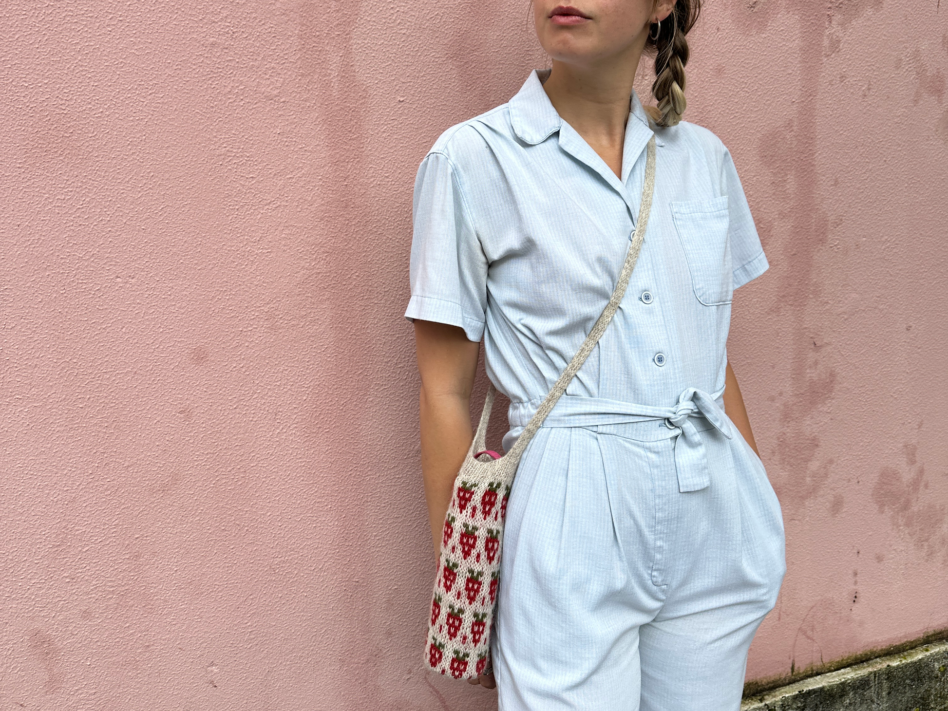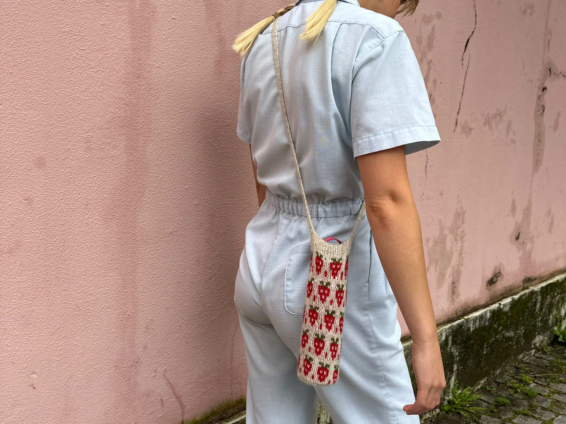 Pomona Bottlebag is a small bag designed to hold your water bottle. The project begins with a stockinette stitch base, shaped using increases and decreases. Stitches are then picked up and knitted along the edge of the base, and the bag is worked in the round in stranded colourwork following a chart. The piece is finished with a ribbed edge and a strap.
