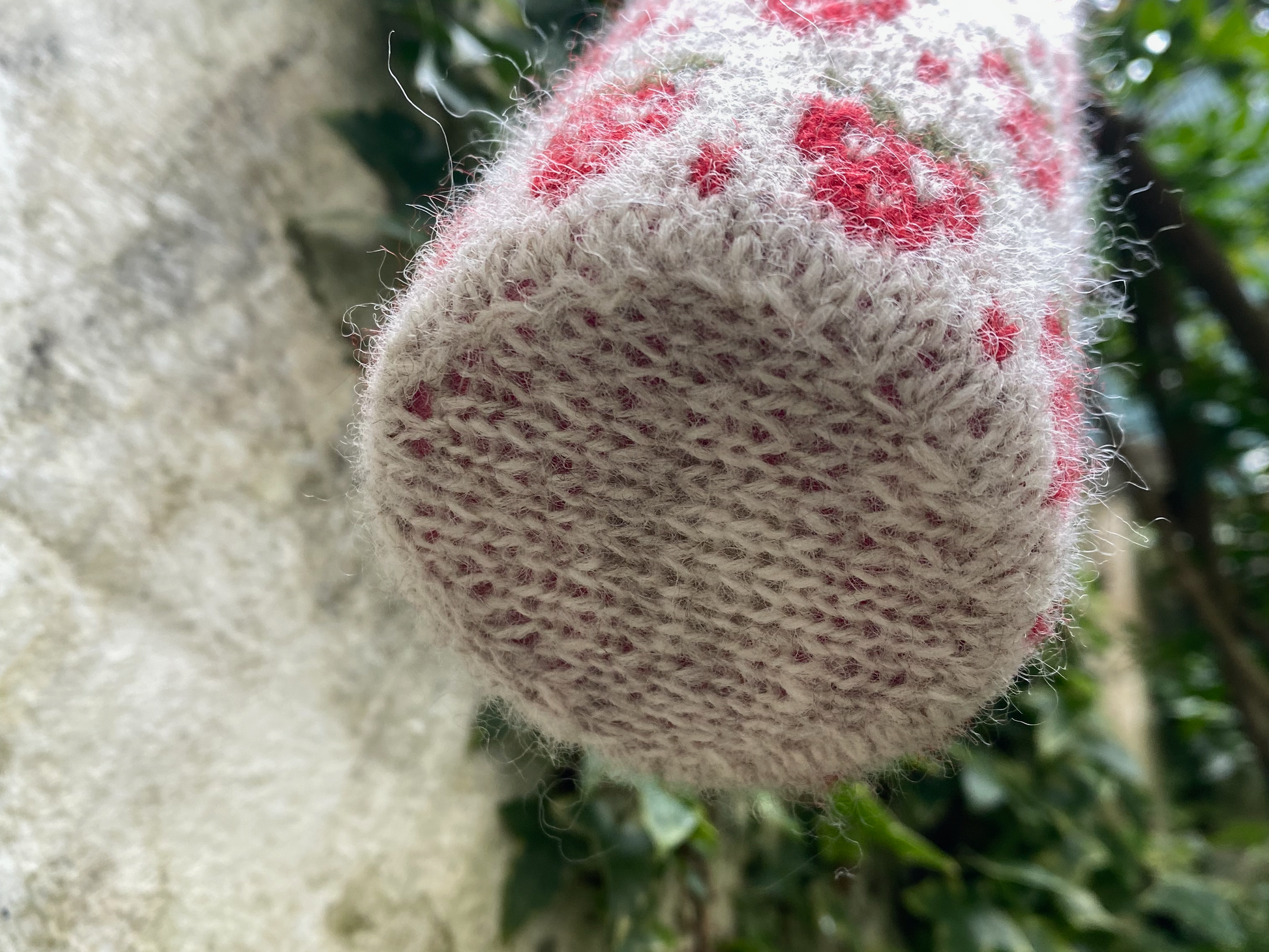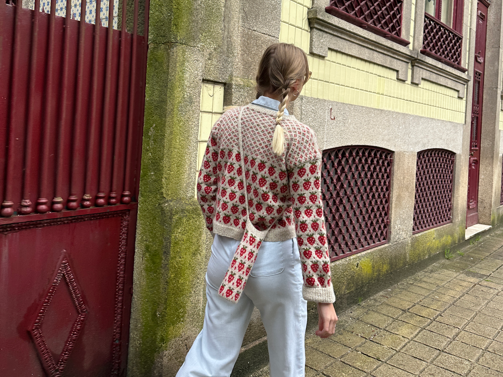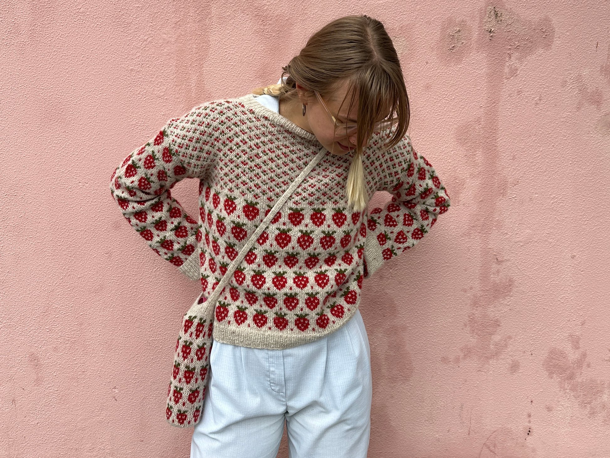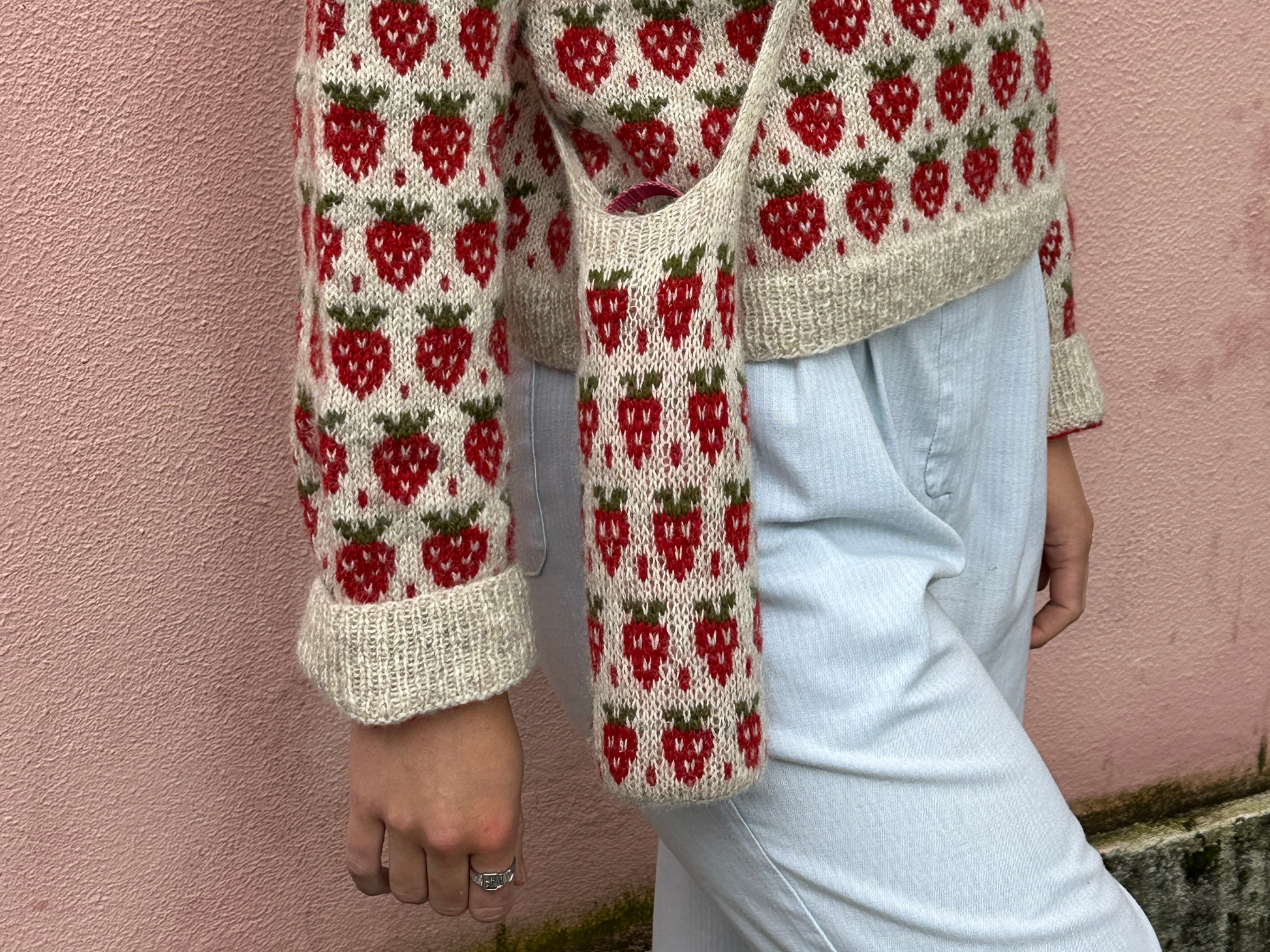 Pomona Bottlebag is a small bag designed to hold your water bottle. The project begins with a stockinette stitch base, shaped using increases and decreases. Stitches are then picked up and knitted along the edge of the base, and the bag is worked in the round in stranded colourwork following a chart. The piece is finished with a ribbed edge and a strap.